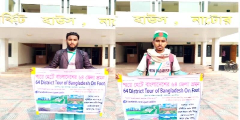 জাতীয় পতাকা মাথায় বেঁধে পায়ে হেঁটে দেশের ৬৪ জেলা ভ্রমণ শুরু করেছেন দুই সহধর হাফেজ সিয়াম উদ্দিন ও সায়োম উদ্দিন। এরই মধ্যে ২৩ জেলা ভ্রমণ শেষে গতকাল সোমবার নাটোর অবস্থান করেন তারা। হেঁটে ভ্রমণে পায়ের বিভিন্ন জায়গায় ক্ষত আর শারীরিকভাবে দুর্বল হয়ে পড়েছেন তারা দুই ভাই।